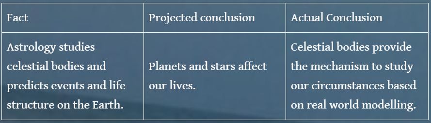 - Apart from all these statistical tests, scientists and astronomers are fixated on finding the physical, chemical or biological phenomena that relates celestial bodies to human personality (For example, Richard A. Crowe 1990, James R. Barth et al 1974. In fact, there have been over a hundred such publications). And when they could not find any, astrology was simply declared as pseudoscience, without considering the fact that to validate an entire study, the dedicated study of the science itself is necessary first. Anyway, this point is null and void as the basis of this argument itself is flawed. Refer to the table below which explains how astrology is projected into the wrong conclusion.