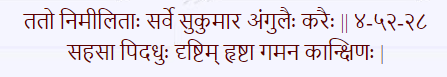 The two crucial shlokas in the Kishkindha Kanda, which explain the time concept of the wormhole. The first explains how the Vanaras closed their eyes and Swayamprabha transported them out of the cave in barely a minute. The second explains how the Vanaras discover that a month has passed on Earth despite them having spent only some time to eat in the cave.