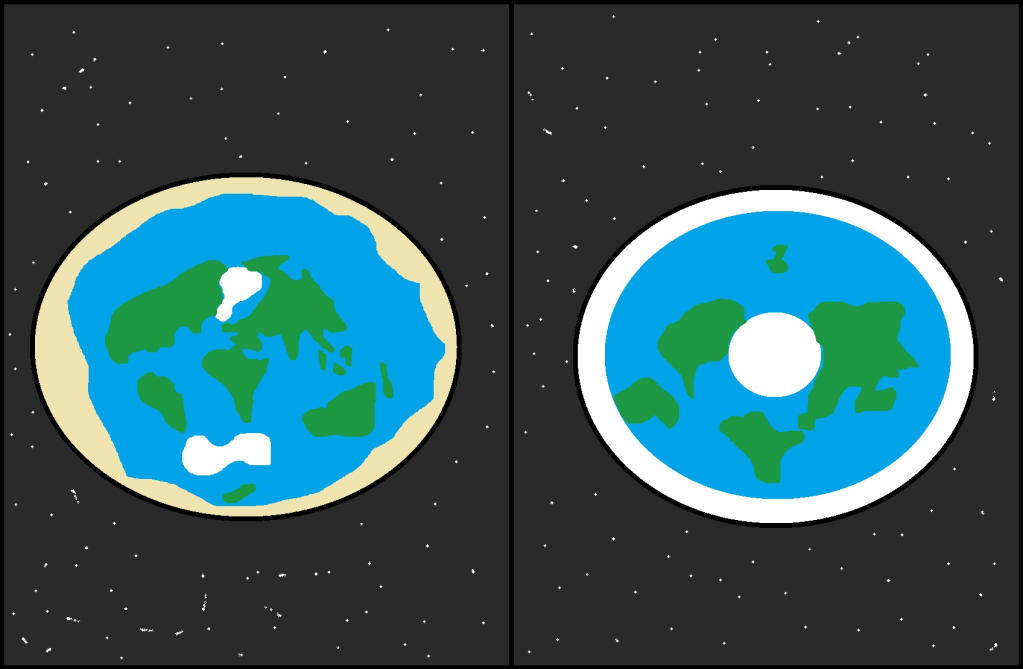 Also, an important point to note is that flat earthers don’t have a single model that each of them follows. Some are of the opinion that the North and South poles are on the disk at two opposite points on the top and bottom, surrounded by walls of rock or ice at the edges of the Earth, and others are of the opinion that the North pole is in the center of the disk and the South “pole” is basically ice walls all around the disk Earth. The following image is the major two models of the flat Earth that are prevalent. There may be more but these are the most popular ones. There is also a small minority that says that Earth is an infinite plane and has no edges.